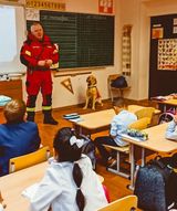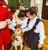 Перед началом осенних каникул мы с ребятами встретили истинных героев, наших добрых друзей и необычных гостей для стен школы. К нам пришли спасатель МЧС Петров Георгий Владимирович и настоящая поисковая собака по имени Рокки!